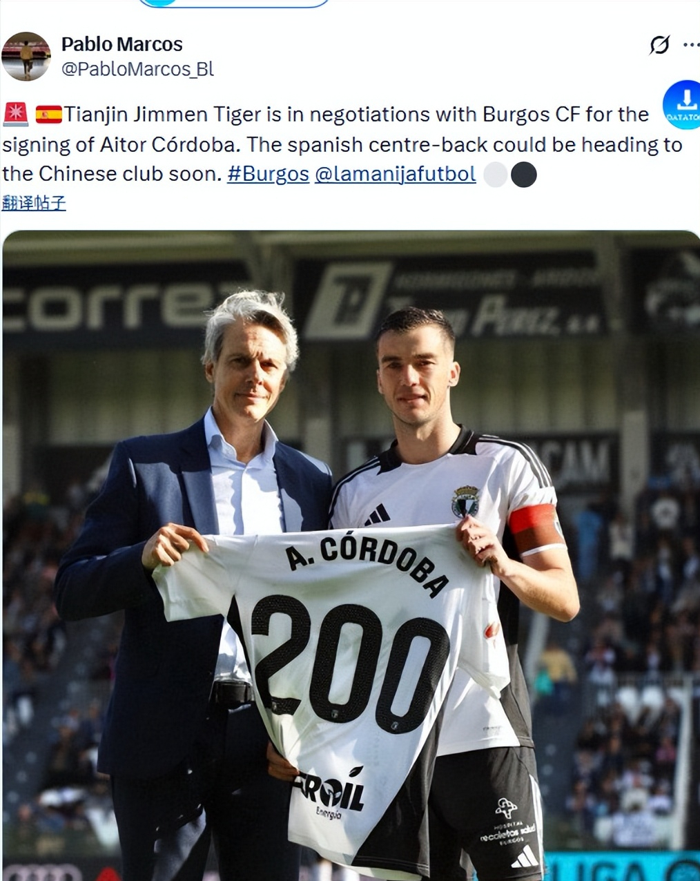 日前,当布尔戈斯主帅证实队长科尔多瓦将转会中国联赛,这位30岁的西乙主力中卫立刻成为转会市场焦点。191cm的身高、近7年队史的稳定履历、120万欧元的亲民身价,再加上兼具高空优势与出球能力的特质,让他成为中超球队补强后防的优质目标。结合多方消息源与球队需求来看,天津津门虎是最接近签下他的俱乐部,双方谈判已进入收尾阶段,加盟只是时间问题,其他球队大概率难以截胡。