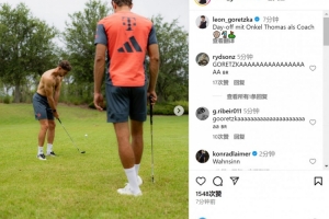 拜仁晋级世俱杯8强,球员们迎来了休息日,格雷茨卡社媒晒出与穆勒一起打高尔夫球的照片,并配文:“与托马斯叔叔一起度过休息日,他担任教练。”